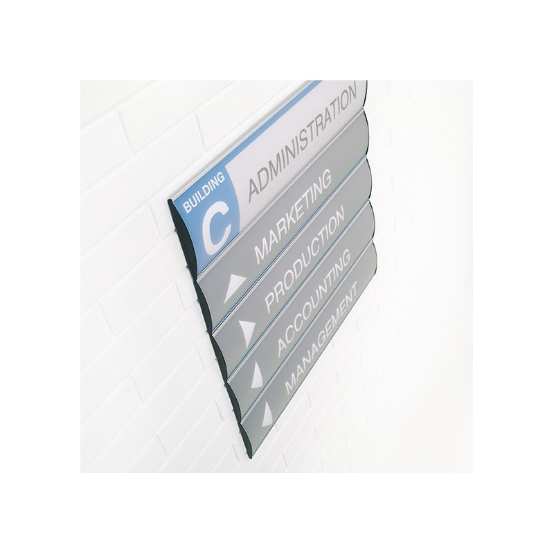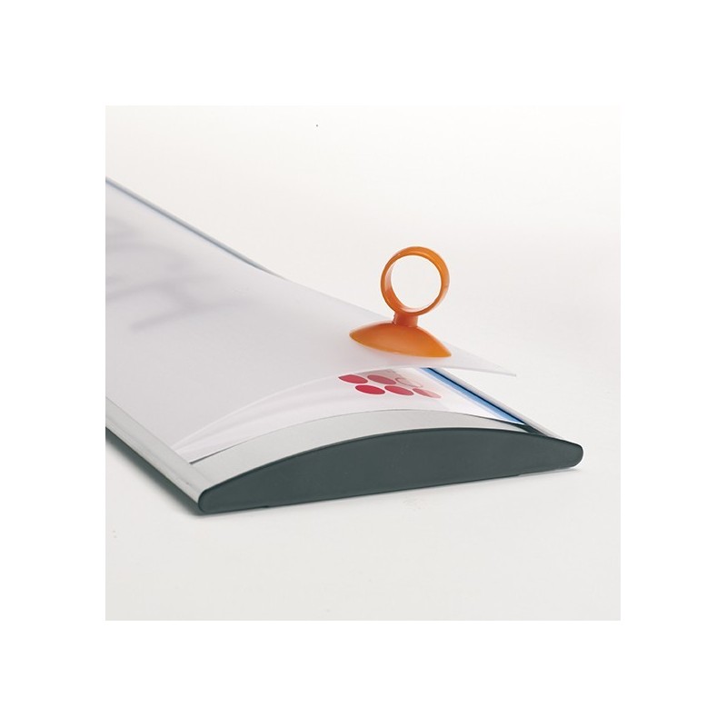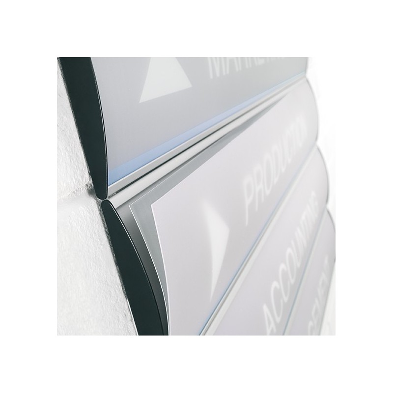 Rótulo mural de perfil curvo. Está fabricado con perfil de aluminio anodizado en color plata mate. El soporte permite la incorporación del papel (pictograma o texto). Mediante una ventosa especial se puede levantar frontalmente el plástico transparente que lo protege. Con el plástico colocado, el documento no puede manipularse. Se aplica sobre la pared mediante tornillos.